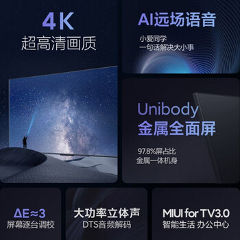 4、小米EA75电视机赶上搞活动直播下单的,到货很迅速。送货前提前联系。物流送货服务好,到货迅速。小哥态度很好,安装迅速,服务优质。电视清晰,音效好。推荐!材质外观和质量一看就很不错,非常喜欢,买来给父母用的,买小米主要的原因就是有小爱同学,父母用起来会简单的多,小爱识别准确,屏幕色彩艳丽,音响也还可以 ,美中不足偶尔还是会有卡顿,而且电视上半部分太薄了,占用空间是由下半部分的厚度决定的,上面做的再薄有什么用,这样又没了外壳保护,还易碎,完全就是个没营养的设计,真心没必要,我家是买回来壁挂的,自己安装,安装时需要超级小心,真的怕上半部分搞不好就碎了