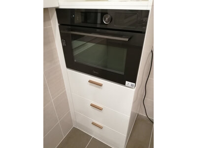 4、美的BS5055W蒸烤箱本来是计划买普通款,后来发现升级款尺寸与普通款一致,干脆加点钱上升级颜值很高,黑色很大气,尺寸预留很合适,记得预留16A插座及考虑电源线长度美的蒸烤一体机相当不错,容量大,做的东西也非常好,安装的时候也非常的认真,售后服务很好,可以做很好的饭菜了,又能蒸又能烤,安装好了也显得厨房高大上,瞬间提升颜值,看上去非常棒