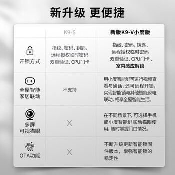 1、凯迪仕k9s和k11区别对比看来不算特别的大,都算比较好的啦,相对而言推荐大家入手凯迪仕K9-S智能锁,京东快递 使命必达 包装颜值 简约大方 ,预约安装 次日即达 小哥威武 技术精湛 解说精准 施工精细 精雕细琢 匠人匠心 安装使用 密码设置 服务热情 ,华为门锁 外观大气 钢琴烤漆 航铝材质 安全芯片 操作上手 开关流畅 国产品牌 值得信赖