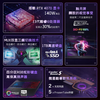 微星(MSI)魔影15游戏本 15.6英寸高性能电竞笔记本电脑(13代酷睿i9-13900H 满血RTX4070 16GB 1TB 2.5K 165Hz P3色域)到手价格不高于10299元。