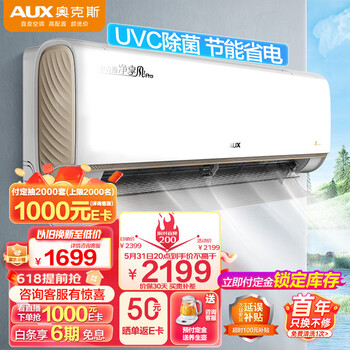 奥克斯(AUX)大1匹空调 新一级能效 家用冷暖壁挂式 WiFi智控 紫外线除菌KFR-26GW/BpR3DQJ1(B1)到手价格不高于2399元。