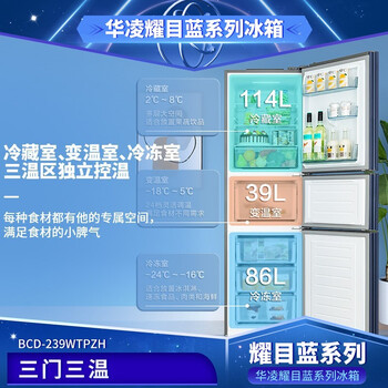 4、华凌BCD-239WTPZH冰箱外形外观:外观高端大气上档次,颜值高,外观很漂亮,颜色时尚,很实用,功能齐全,APP控制,控温精准,制冷效果:制冷效果非常好,制冷快。工作时压缩机声音小,无噪音,容量大小:容量很大,606L大容量,可以存放好多食材,总结:冰箱质量超级好,售后很贴心,绝对有保障,放心购买!外观稳重,看着舒服,颜色满意,内部空间确实够大,设计的很方便,不用担心各种东西放不下了,看了很多款式,最终买了这台,不错。