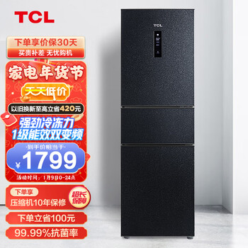 TCL 256升双变频三门冰箱一级能效风冷无霜电冰箱 AAT养鲜 电脑温控 以旧换新BCD-256WPJD到手价格不高于1799元。